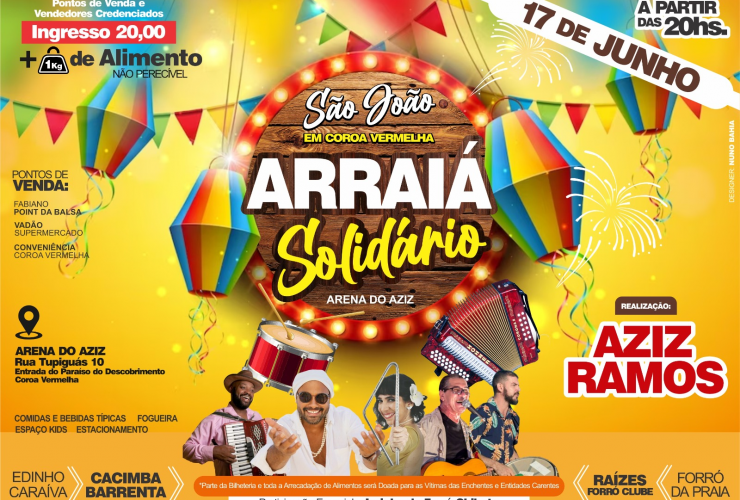 Arraiá Solidário promete agitar a cidade com uma mistura de atrações e muito forró pé de serra.Vão marcar presença as bandas de forró Cacimba Barrenta, Edinho Caraíva, Raízes Forró Clube e Forró da Praia. Preparem-se para uma noite de pura animação e muito forró, sábado dia 17 de junho, na Arena do Aziz, em Coroa Vermelha. O evento promete agitar ...