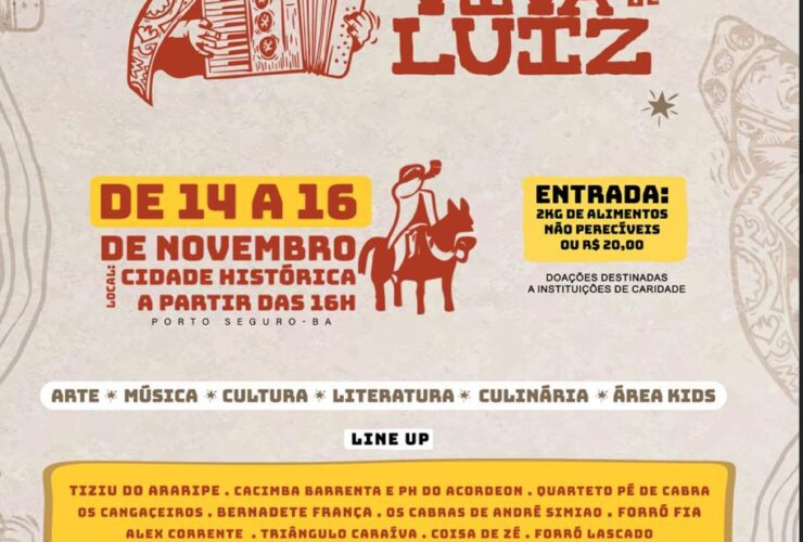 Nos dias 14, 15 e 16 de novembro, a Cidade Histórica de Porto Seguro receberá o Festival Viva Luiz 2025, reunindo 18 atrações musicais de diferentes estados do Brasil, incluindo São Paulo, Espírito Santo, Pernambuco, Ceará, Santa Catarina e, claro, a Bahia. Entre os destaques estão Chambinho do Acordeon, intérprete de Luiz Gonzaga no cinema, Tiziu do Araripe, Cacimba Barrenta, ...
